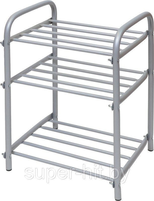 Металлический каркас.Три полки для размещения обуви.Пластиковые колпачки на ножках защищают поверхность пола от царапин.