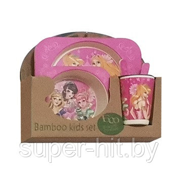 Набор эко-посуды из бамбука "Принцессы". В наборе: стаканчик, тарелка на два деления, миска, ложка, вилка.